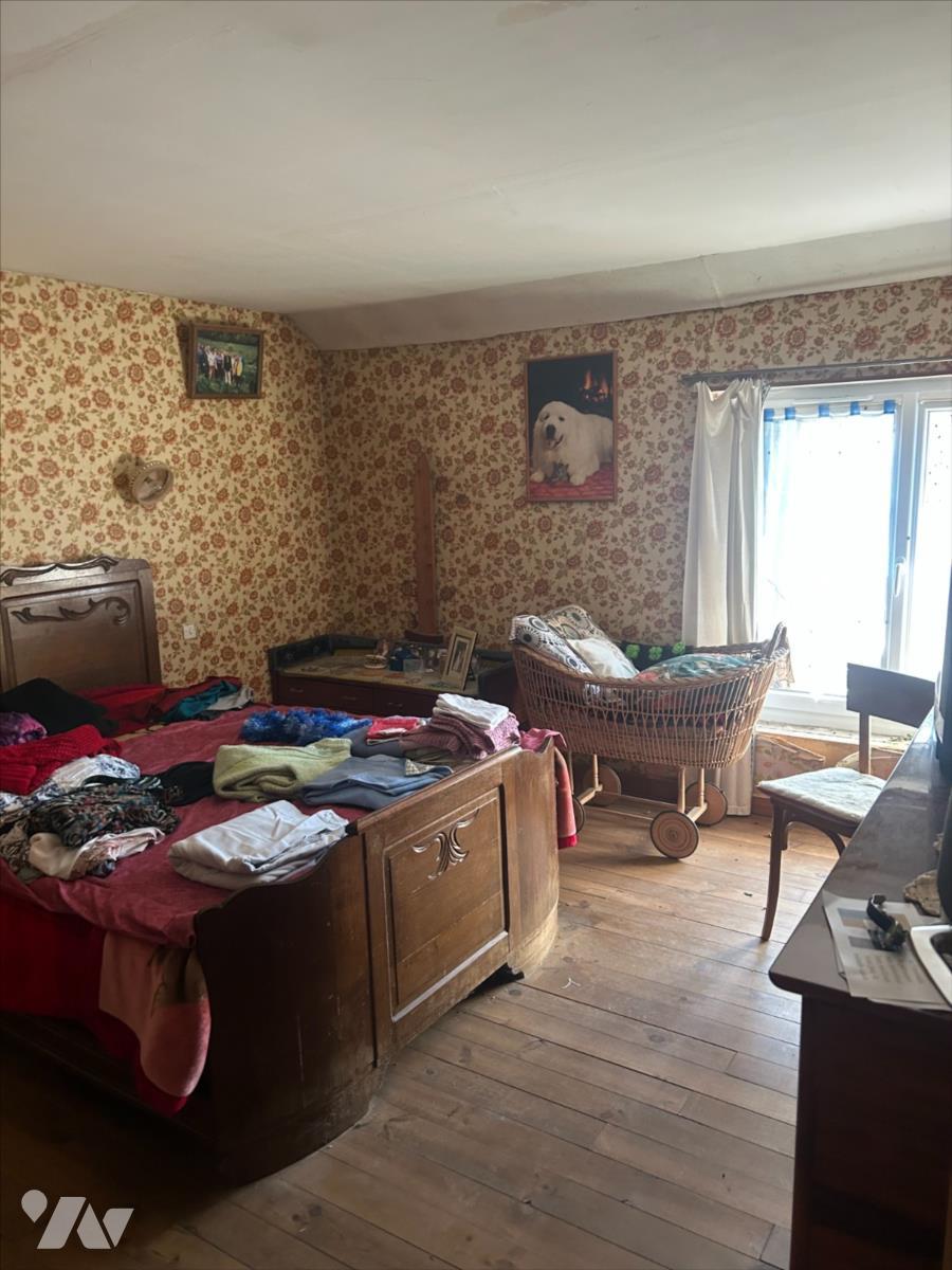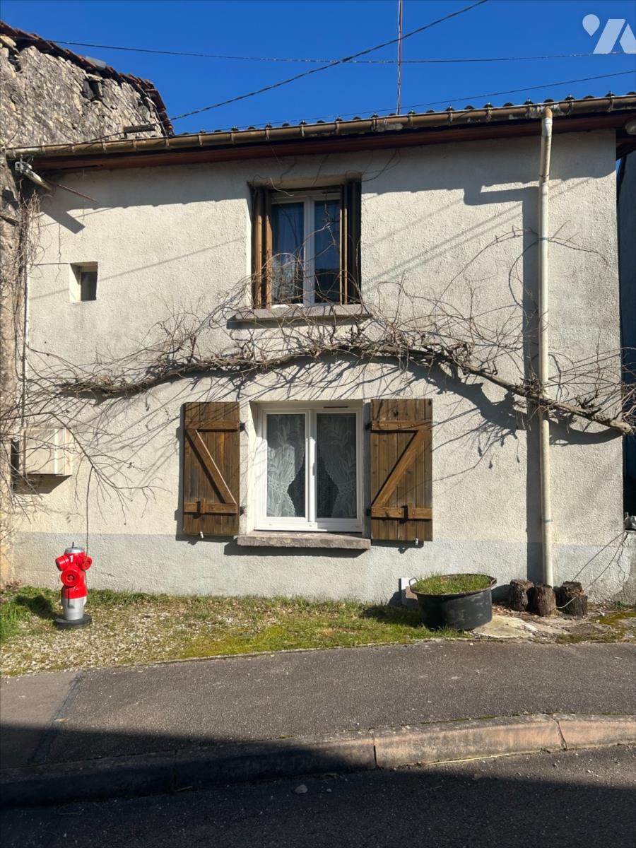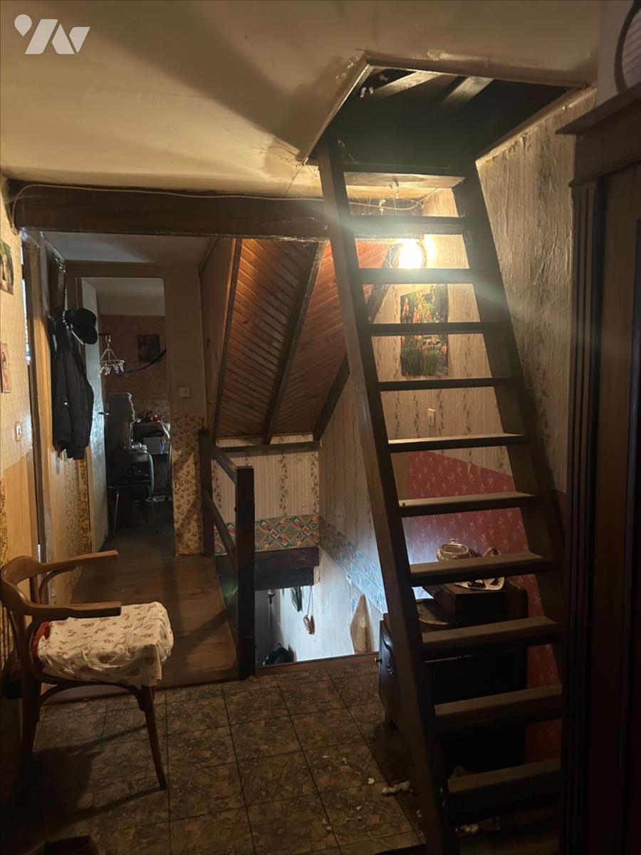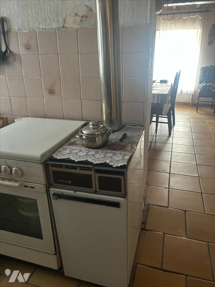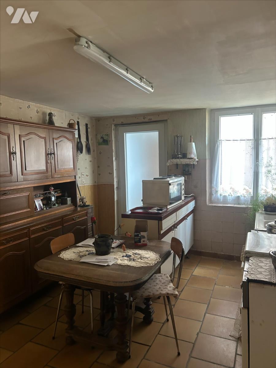 Maison de village, sans terrain et garage, Elle se compose: RDC: entrée, cuisine, salle d'eau avec WC, cuisine avec gazinière bois, séjour avec poêle, une cave, cellier, une pièce, A l'étage: dégagement, deux chambres, placard, grenier, (double vitrage).